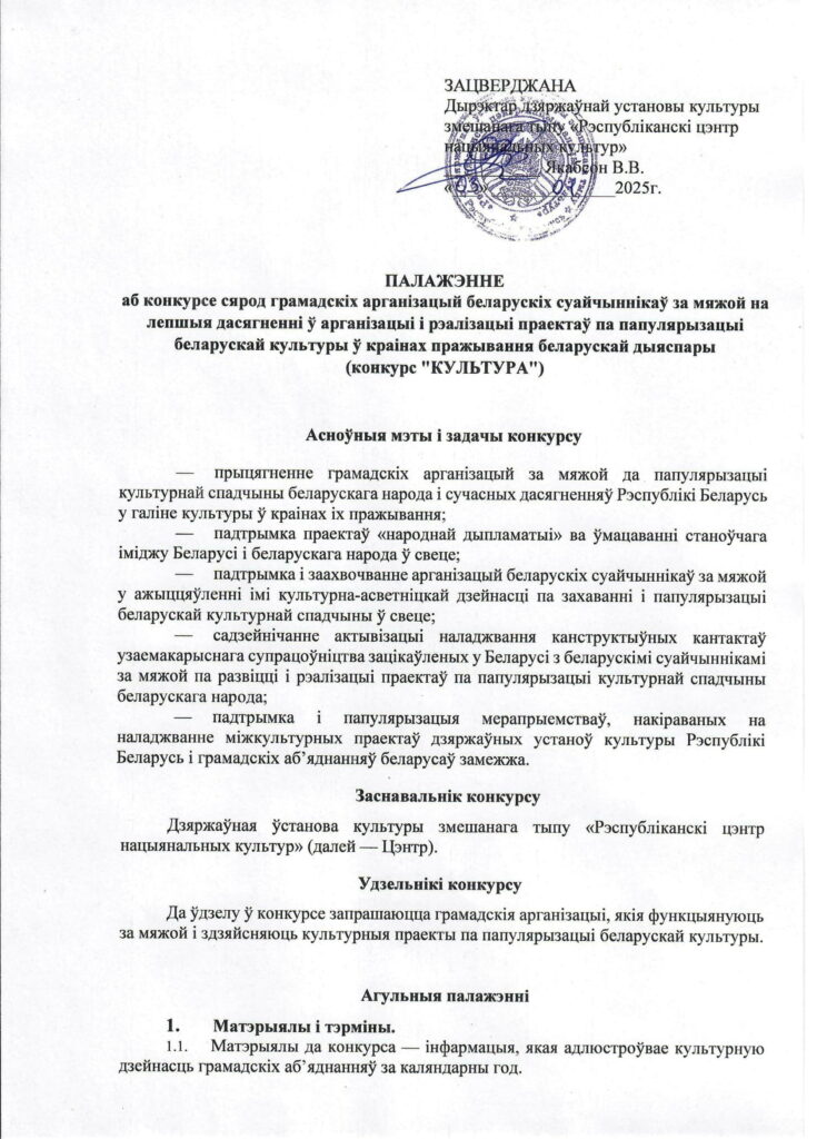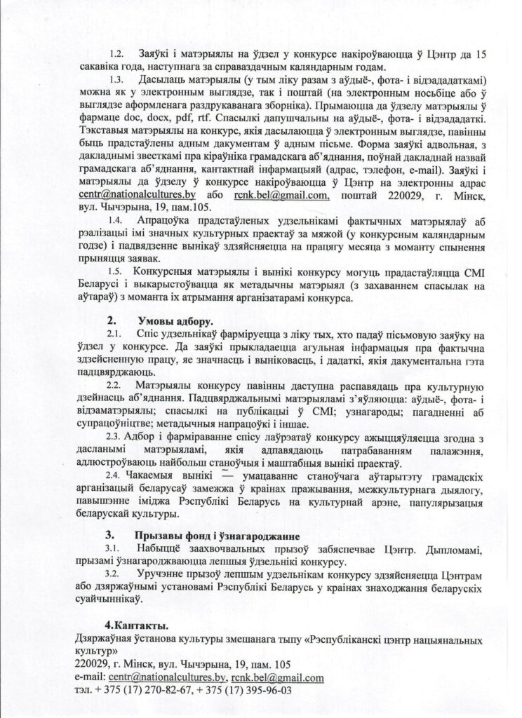 Запрашаем вас прыняць удзел у конкурсе сярод грамадскіх арганізацый беларускіх суайчыннікаў за мяжой на лепшыя дасягненні ў арганізацыі i рэалізацыі праектаў па папулярызацыі беларускай культуры ў кpaiнax пражывання беларускай дыяспары (конкурс «КУЛЬТУРА»). Конкурсныя матэрыялы павінны змяшчаць інфармацыю пра дзейнасць вашай арганізацыі за 2025 год (праекты, мерапрыемствы, удзел у фестывалях і конкурсах, форумы і г.д.). Дасылаць матэрыялы (у тым ліку разам з фота- і відэа-дадаткамі) можна як у электронным выглядзе, так і поштай. Прымаюцца да ўдзелу матэрыялы ў фармаце docx, pdf, rtf. Спасылкі дапушчальны на фота- і відэададаткі. Тэкставыя матэрыялы на конкурс, якія дасылаюцца ў электронным выглядзе, павінны быць прадстаўлены адным дакументам ў адным пісьме.