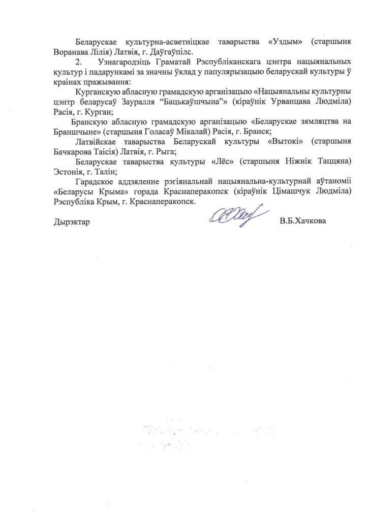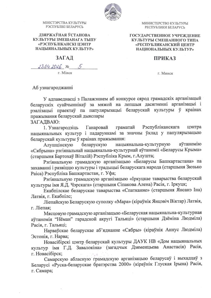 Вынікі конкурсу сярод грамадскіх арганізацый беларускіх суайчыннікаў за мяжой на лепшыя дасягненні ў арганізацыі і рэалізацыі праектаў па папулярызацыі беларускай культуры ў краінах пражывання беларускай дыяспары за 2025 год (конкурс «КУЛЬТУРА»)